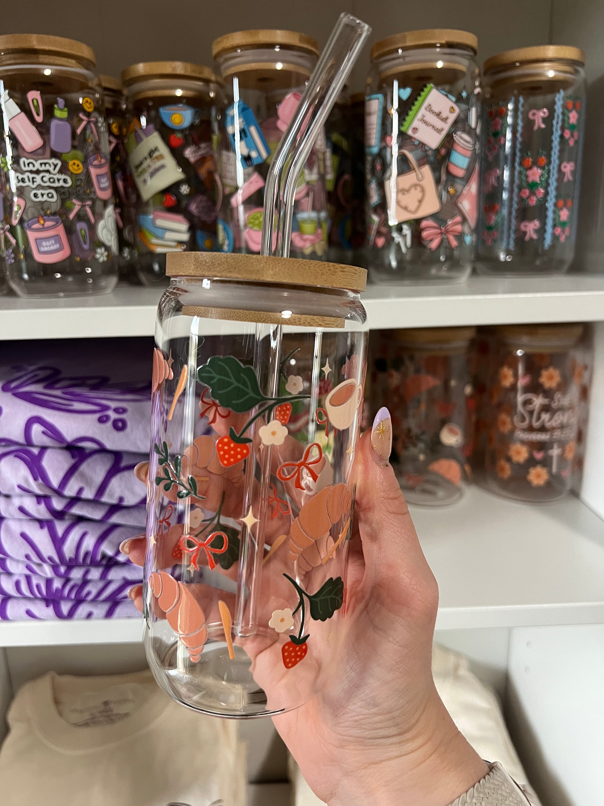 This 16oz Libbey Glass Cup comes with a UV DTF Wrap that is recommended to be hand washed. Your purchase will include a glass cup, lid, and straw.