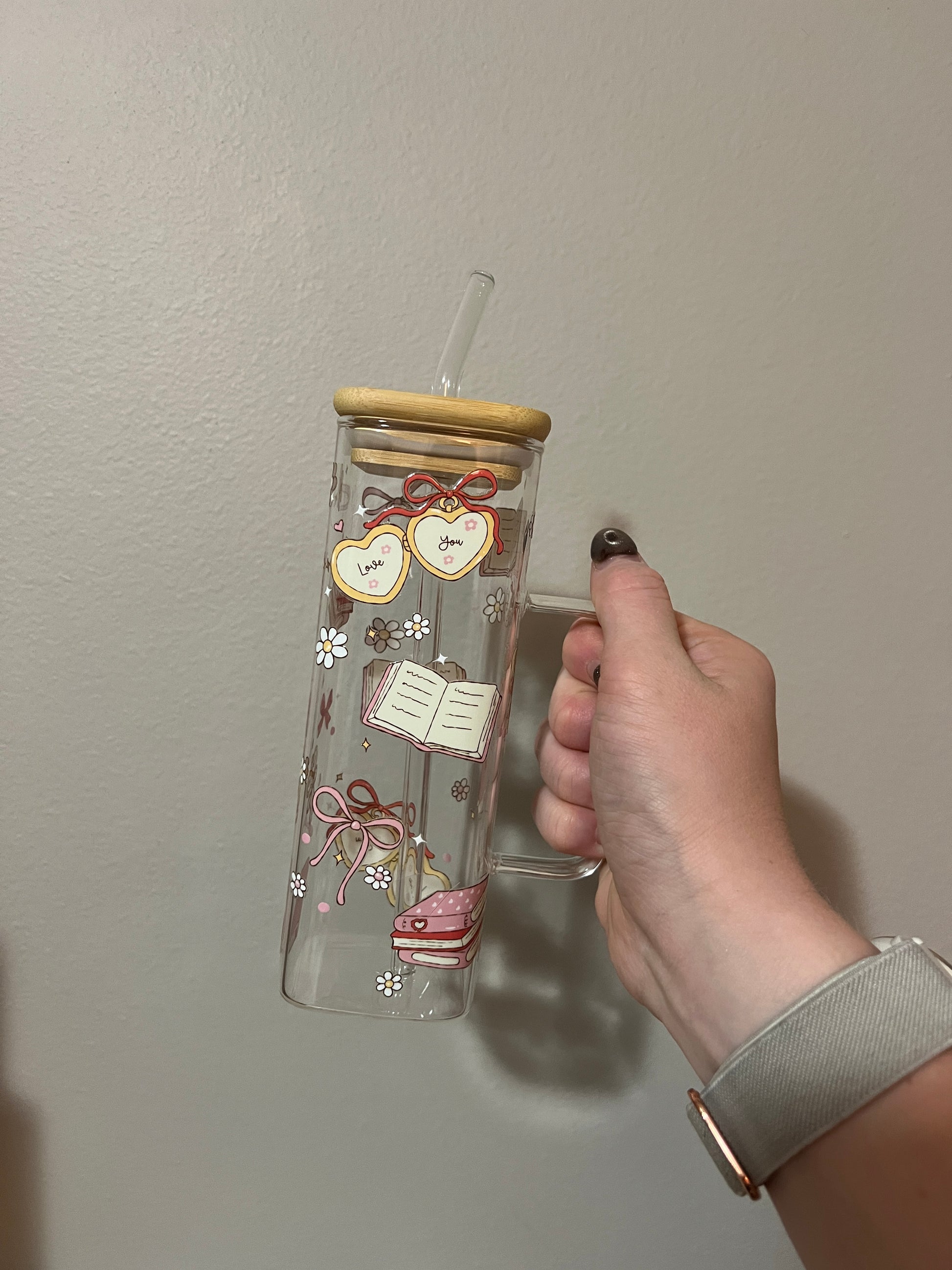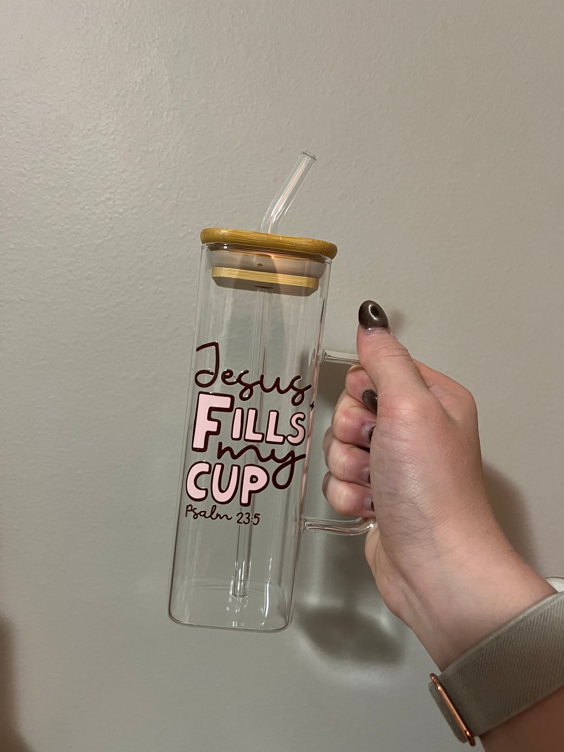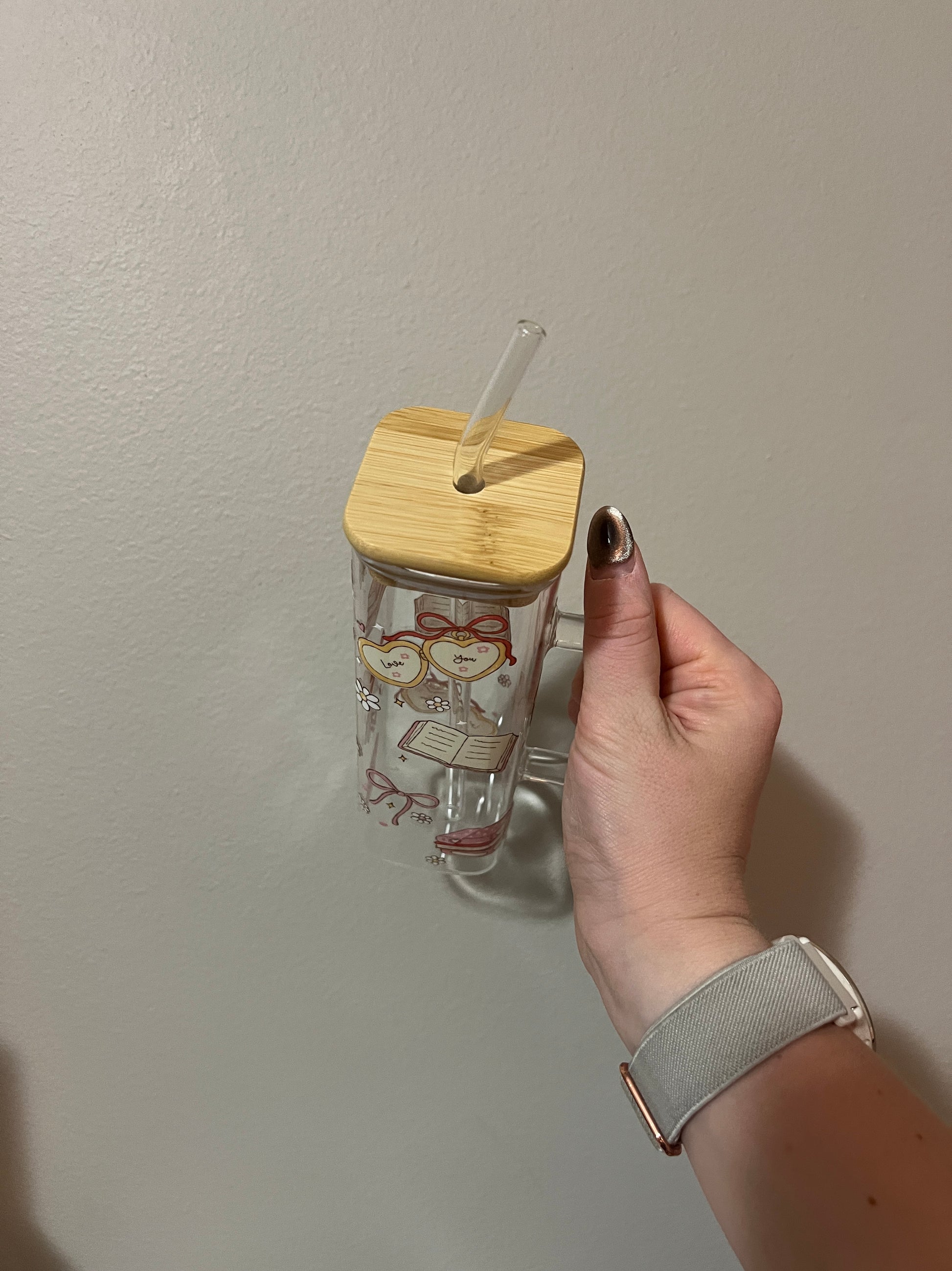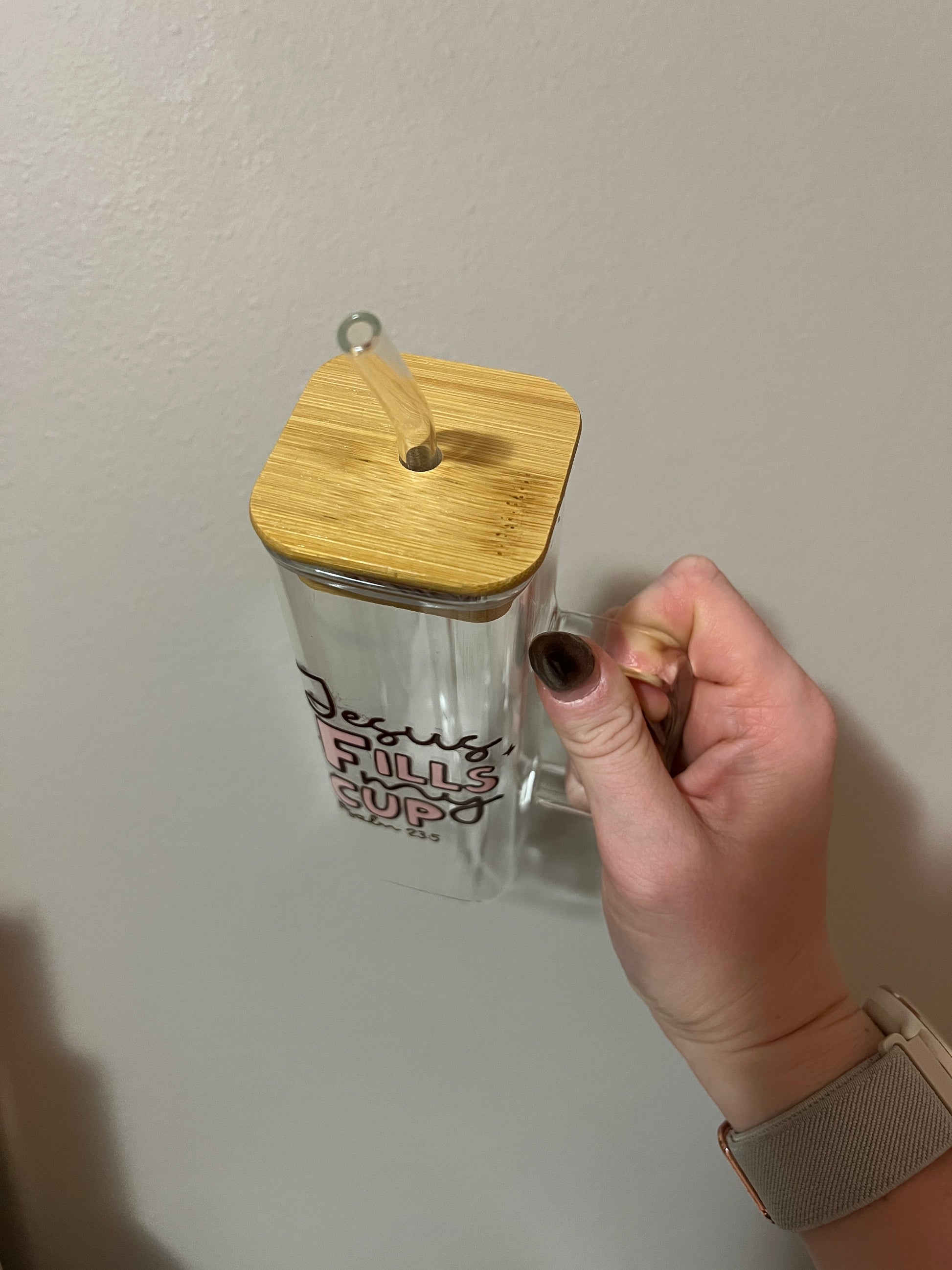 Square tumblers (16oz) with handles. Glass cup with bamboo Lid.